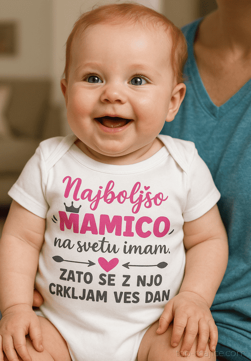 🤱 Mali bodi, veliki objemi! Napis “Najboljšo mamico na svetu imam. Zato se z njo crkljam ves dan” pove vse.
