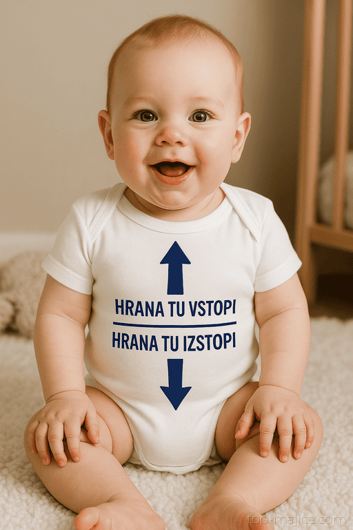 Operacija trebušček v teku! 😄 Bodi z napisi HRANA TU VSTOPI in HRANA TU IZSTOPI sproži smeh pri hranjenju in previjanju. Popolno darilo za novopečene starše in vse z žilico za humor. 👶