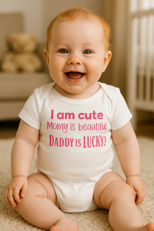 Ko je outfit bolj zgovoren kot babičin FB status! 😄 Bodi z napisom “I am cute Momy is beautiful DADDY is LUCKY!” pove vse namesto vas. Popoln za novorojenčke in starše z dobrim smislom za humor. 👶❤️