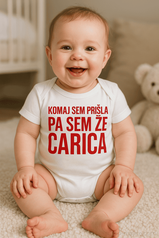 Bel otroški bodi s kratkimi rokavi in rdečim napisom na sprednji strani je zabavna uniforma za vsako malo princesko, ki jemlje dremež resno in srca še bolj. Popoln kos za fotke, prve obiske in vse trenutke, ko je kristalno jasno, kdo je glavni.