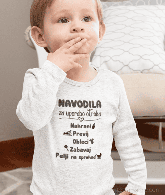 Starševstvo nima priloženega priročnika, zato je ta svetlo siv bodi prava rešitev s humorjem. S sprednjim napisom NAVODILA za uporabo otroka ❤️ Nahrani 🍼 Previv 👶 Obleci 👕 Zabavaj 🎉 Pelji na sprehod 🛒 in zabavnimi ikonami jasno pokaže dnevni plan malega šefa. Odličen za starše, ki cenijo praktičnost in še raje dober smeh.