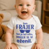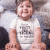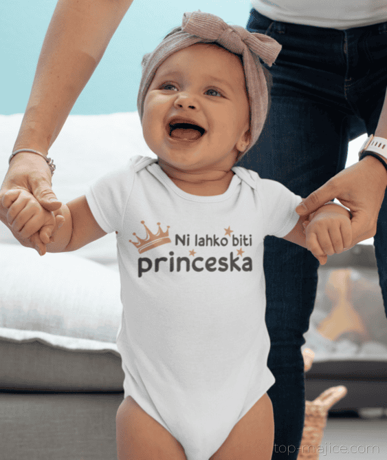 Ta bel bodi s kratkimi rokavi in potiskom “Ni lahko biti princeska” je uniforma za vsakodnevno kraljevanje nad dudo, dremežem in dvorom starih staršev. Napis pove, kar vsi vemo: vladati je naporno, še posebej, ko te prekinjajo za kupček. Idealno za fotografije, vozičkanje in nasmehe, kjerkoli se pojavi mala visokost.