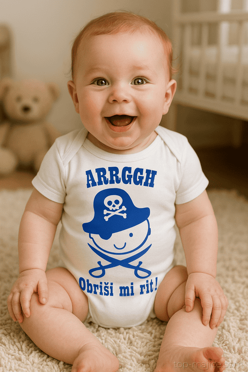 Mini pirat kriči: “ARRGGH Obriši mi rit!” 🏴‍☠️ Ta beli bodi z modrim motivom poskrbi za smeh pri vsaki previjalki. Popolno za novopečene starše z morskim smislom za humor! 😉