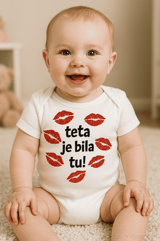 Rdeči poljubčki + črn napis = recept za krohot in nepozabne fotke. Ta simpatičen bodi sporoča vsem (tudi brez dokazov na ličkih), da je tetin obisk uspešno zaključen. Idealno, ko želite malo nagajivosti in veliko ljubezni v mini velikosti.