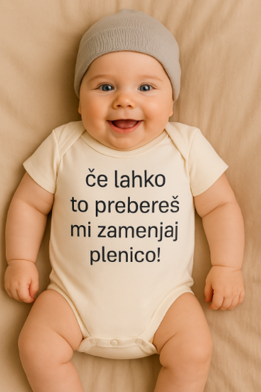 Ko nos sproži alarm, naj spregovori bodi! 😂 Krem bodi z napisom ‘če lahko to prebereš mi zamenjaj plenico!’ je instant komedija. Super za starše z humorjem in za baby tuše. 🍼