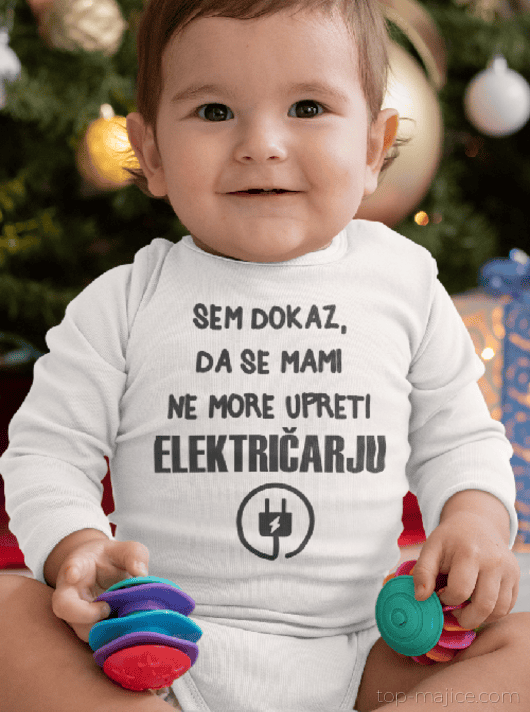 Ko dojenček nosi ta napis, se nasmehne še štekar. Zgodba o mami, električarju in mini čudežu je zbrana v enem kosu, ki dvigne napetost smeha na vsakem obisku. Idealno za tiste, ki radi povedo malo več, še preden otrok spregovori.