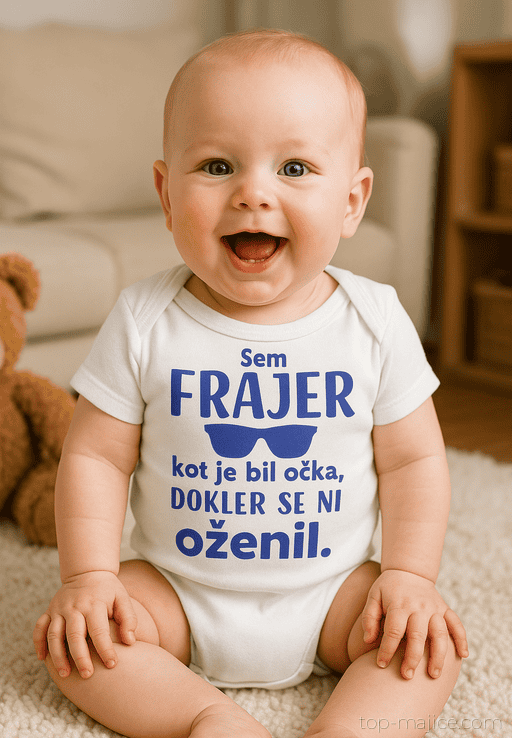 Frajer v plenicah prihaja! 😎 Bel bodi s kratkimi rokavi in modrim tiskom z napisem “Sem FRAJER kot je bil očka, DOKLER SE NI oženil.” Popolno darilo za starše z dobrim humorjem! 🎁
