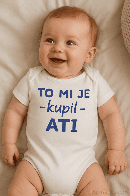 Ati ima dokaz! 😄 Ta beli bodi s potiskom “TO MI JE -kupil- ATI” bo nasmejal vsakega obiskovalca. Odlično za ponosne očke in njihove male šefe. 👶💙