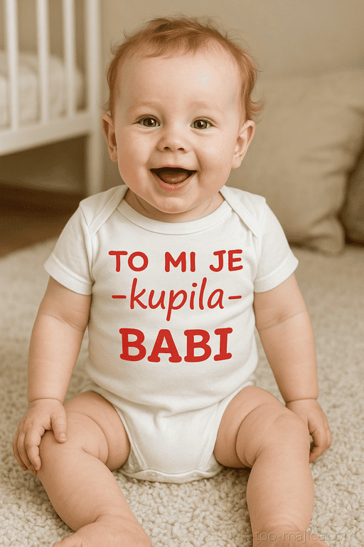 Babi pride, vidi in opremi! Bel bodi z rdečim tiskom prinese smeh na vsako fotko in uradno potrdi, da je babi glavni sponzor ljubkosti. Popoln kos za mini zvezdice in maxi ponos.