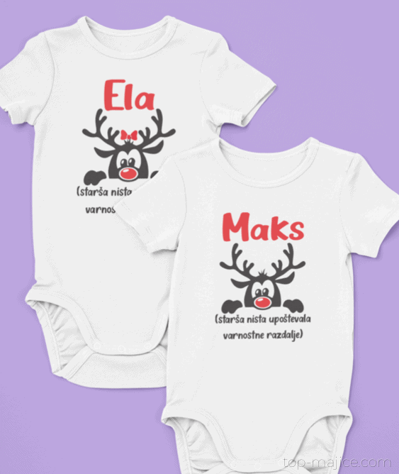 Dva bela bodija s kratkimi rokavi in prikupnim jelenčkom nosita legendaren napis: ‘Ela (starša nista upoštevala varnostne razdalje)’. Popolna kombinacija za prve fotke, obiske in vse tiste trenutke, ko se mala Ela odloči za hudomušne grimase. Spodnji pritiskači poskrbijo, da je previjanje hitrejše kot jelenčkov sprint.