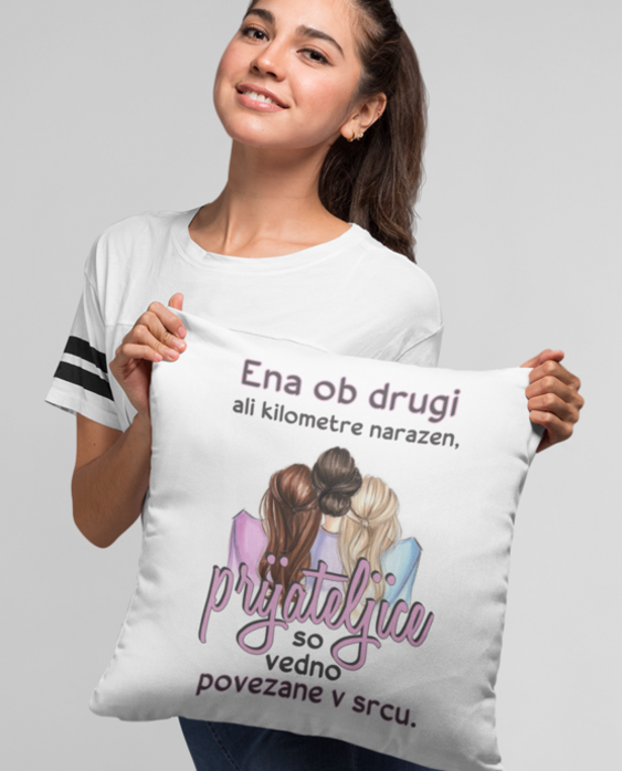 Ko je prijateljica na drugem koncu, blazina drži fronto objemov! 😄 “Ena ob drugi ali kilometre narazen, prijateljice so vedno povezane v srcu.” Popolno darilo za BFF, sestro po duši in vašo klapo sodelavk! 💕