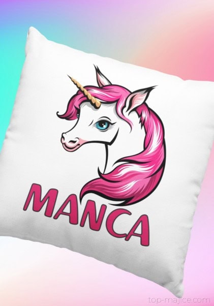 Bela kvadratna blazina s prikupnim samorogom, rožnatimi lasmi in zlatim rogom izstopa z drznim rožnatim napisom MANCA. Je zabaven statement kos, ki takoj pove, kdo tu vlada udobju. Odlično popestri dnevno sobo, pisarno ali skrivno dremež cono.