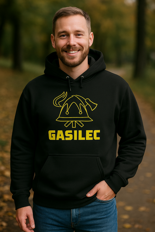 Gori stil, ne garderoba! 🔥 Ta črn pulover kriči GASILEC in pokaže rumeno čelado s plamenom in sekiro. Idealno za gasilce in vse, ki navijajo zanje. 🧯