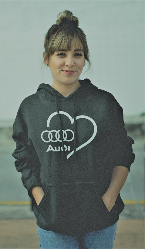 Črn pulover s kapuco z belim srcem in sloganom Audi jasno pokaže, komu je zvest tvoj volan. Dovolj zabaven za vsak dan in dovolj pogumen za večerne sprehode – in odličen, ko želiš reči: “moje srce vozi na štiri kroge”. 😄