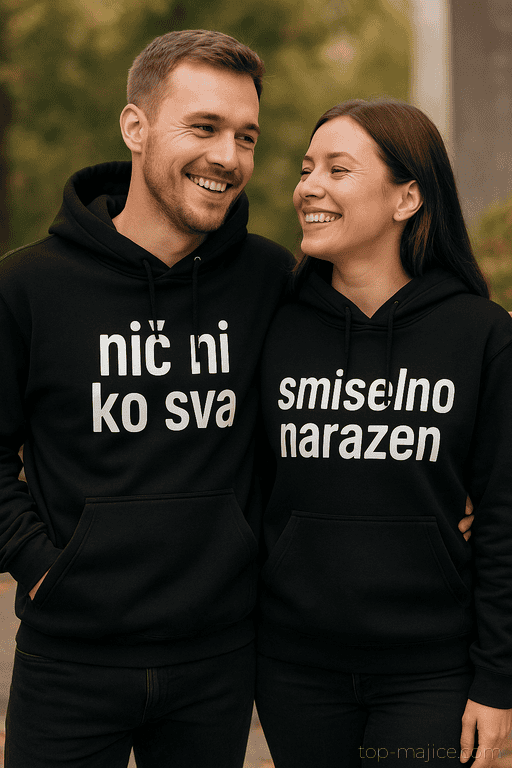 Vsak pulover nosi del slogana, celota pa nastane, ko se vidva srečata. To je modni inside joke za pare, ki se znajo pohecati iz (pre)resnega sveta in obenem izgledati usklajeno. Idealno za nasmejane fotke, večerne sprehode in tiste “pridi sem” objeme.
