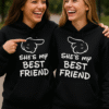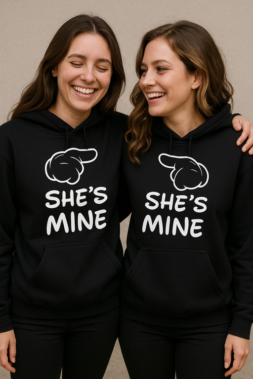Prst kaže, srce izbere! 👉🖤 Komplet dveh črnih puloverjev s kapuco in napisom SHE’S MINE glasno (in zabavno) pokaže, kdo je tvoj. Idealno za pare, ki radi nosijo humor na prsih. 💑