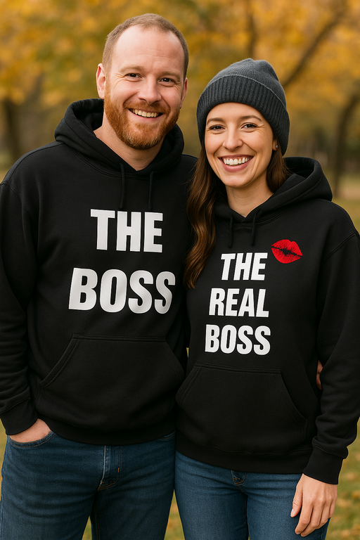 En pulover razglasi THE BOSS, drugi pa (seveda) THE REAL BOSS — z rdečim poljubčkom nad napisom, ki pove: “odločeno!” Idealen za pare, ki šefovanje rešujejo z nasmehom in vsako fotko spremenijo v mini komedijo. Dva črna puloverja, en velik inside joke.