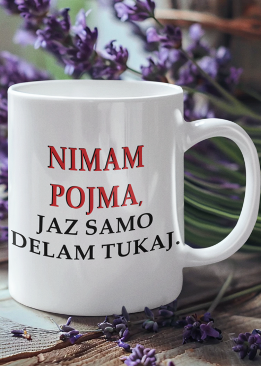 ☕️ “NIMAM POJMA, JAZ SAMO DELAM TUKAJ.” – skodelica za vse, ki preživijo dan na kavi in sarkazmu.