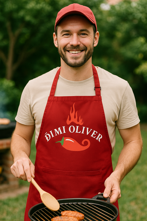 Ta rdeč predpasnik s čilijem in plameni je za vse, ki jedi začinite tudi z dobro mero fore. S sloganom “ĐIMI OLIVER” vsaka omaka dobi karakter, vsak žar pa stand-up nastop. Popestri kuhanje, nasmej goste in pokaži, kdo je šef vročine.