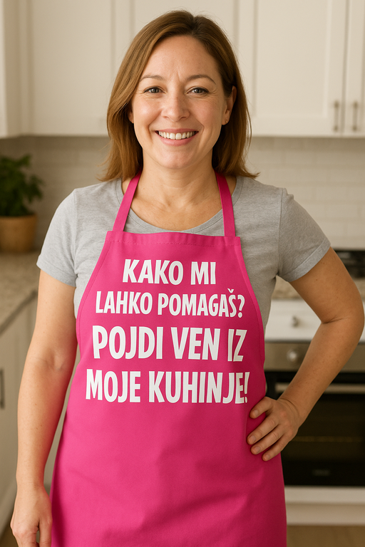 Živo roza predpasnik, ki pove resnico namesto tebe: KAKO MI LAHKO POMAGAŠ? POJDI VEN IZ MOJE KUHINJE! 😄 Popoln za kuharske šefice in šefe s smislom za humor. Odlično darilo za mame, partnerje in prijateljice, ki kuhajo po svojih pravilih. 👩‍🍳🔥