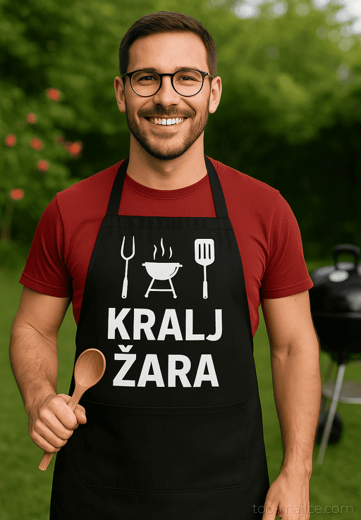 Črn predpasnik z belim tiskom in grafikami žar pripomočkov takoj razglasi, kdo je šef rešetk. Ko se dim vije, vsi vedo, komu prinesti dodatno porcijo – tistemu z napisom KRALJ ŽARA. Popoln za samooklicane žar barone in vse, ki radi mešajo humor s sočnimi zalogaji.