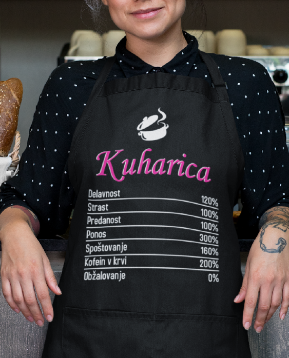 Ko zavre Strast 100% in Ponos 300%, vsi vedo, kdo vodi štedilnik. Ta črn predpasnik z belim in rožnatim tiskom je prava mešanica humorja in samozavesti, ki pove: kuha se z glavo, srcem in kofeinom v krvi 200%.