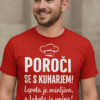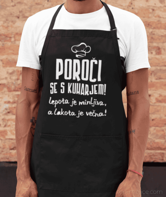 Ko srce reče “da”, želodec pa “še!” 😂 Črn predpasnik s potiskom ‘POROČI SE S KUHARJEM! lepota je minljiva, a lakota je večna!’ je recept za smeh.