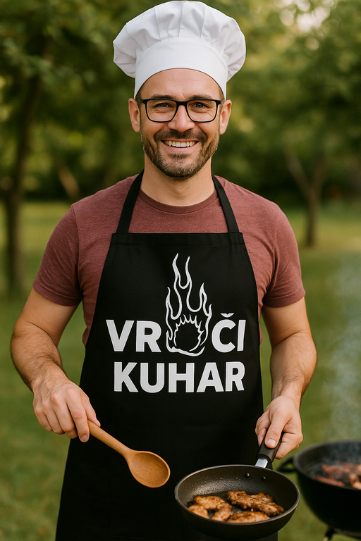 Temperatura v kuhinji narašča! 🔥 Ta črn predpasnik z napisom VROČI KUHAR razglasi, kdo vodi vročo kuhinjo. Odlično darilo za žar mojstre, kulinarične zvezde in vse, ki kuhajo z nasmehom. 😄