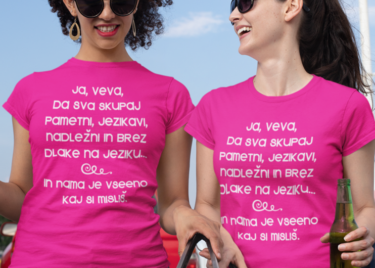 Rožnati duo za neustavljivo dvojico brez filtra! 💕 Na njima piše: ‘Ja, veva, Da sva skupaj Pametni, Jezikavi, Nadležni in brez Dlake na jeziku… in nama je vseeno kaj si misliš.’ Popolno za pare, BFF ali sestre z ostrim jezikom. 😎