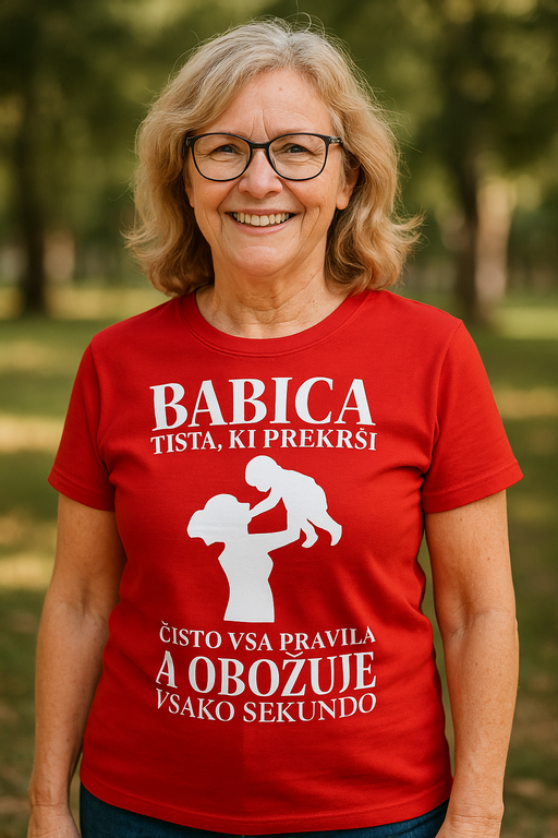 Rdeča ženska majica z belim potiskom in simpatično silhueto pove, kar vsi vemo: babice so kraljice razvajanja. Od kavic do parkovnih avantur – z njo bo vsak objem še toplejši in vsaka pravila še mehkejša.
