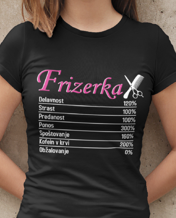 Ta črna, oprijeta ženska majica je kot vizitka za vsako frizerko, ki živi svoj salon. Ko vstopiš med škarje in fen, naj majica pove namesto tebe — tukaj ni blefa, samo rezultati:
