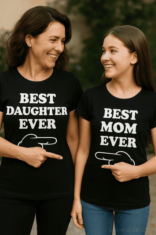 Dvojni dokaz, kdo je v družini top duo! 👩‍👧 Komplet dveh črnih kratkih majic z napisoma “BEST DAUGHTER EVER” in “BEST MOM EVER” ter kazalnima rokama pove vse brez razlage. 😄 Popolno za mame in hčere z navihanim smislom za humor. 💖