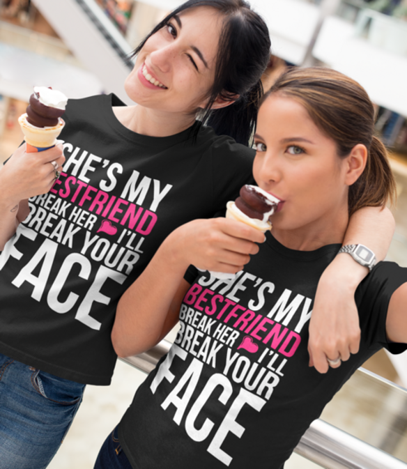 Najboljši prijateljici + ujemajoči majici + sladoled = nepremagljiva ekipa. 🍦😎 Napis “SHE’S MY BESTFRIEND BREAK HER ❤️ I’LL BREAK YOUR FACE” pove vse namesto vaju. Idealno za BFF, ki se radi smejeta in stojita ena za drugo.
