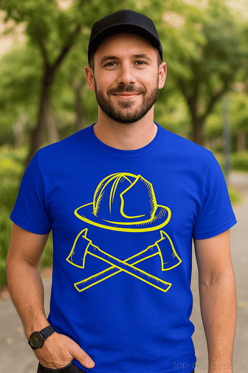 Kraljevsko modra podlaga + rumena grafika = opažen si hitreje kot sirena na intervenciji. V gasilskem domu, na vaji ali pikniku bo jasno: tu prihaja ekipa poguma in dobrega humorja. Ni treba nič reči — emblem čelade nad sekiroma pove vse.