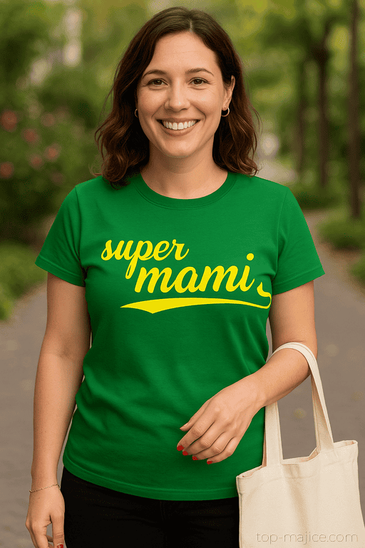 Rumeni napis “super mami” na sprednji strani pove vse, še preden kdo vpraša: kdo je šefica? Ta majica je zabaven, srčen namig, da je mama prava junakinja – brez plašča, a z neomejeno zalogo objemov.