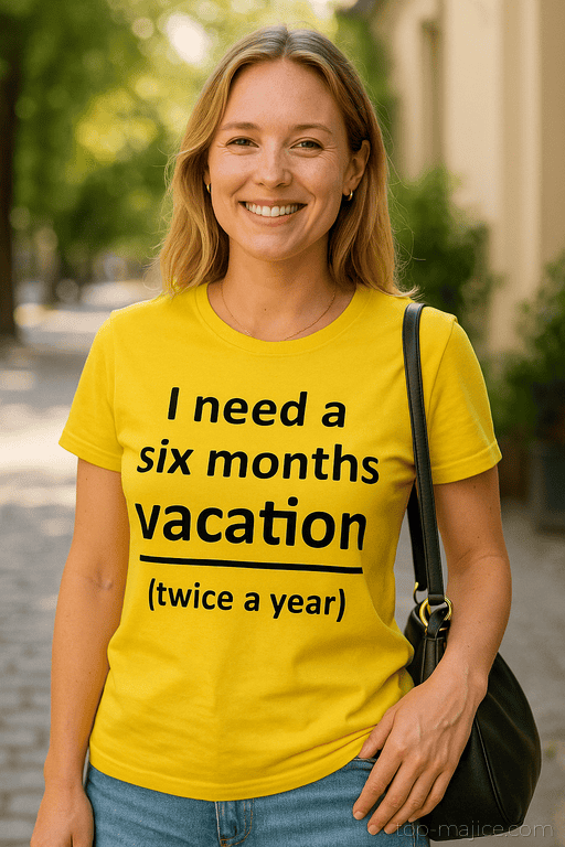 Ta živo rumena kratka majica z okroglim izrezom in črnim tiskom pove natančno to, kar si vsi mislimo. Idealna za petkove sestanke, Zoom klice in čakanje na boarding. Obleci jo in opazuj, kako se produktivnost prevede v: “vidimo se po dopustu”.