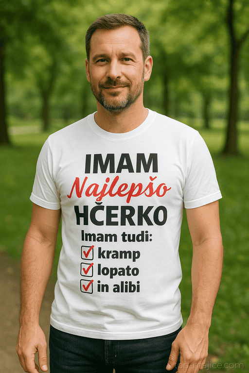 😂 Očka na patrulji? Ta majica pove vse: “IMAM Najlepšo HČERKO Imam tudi: ☑ kramp ☑ lopato ☑ in alibi”