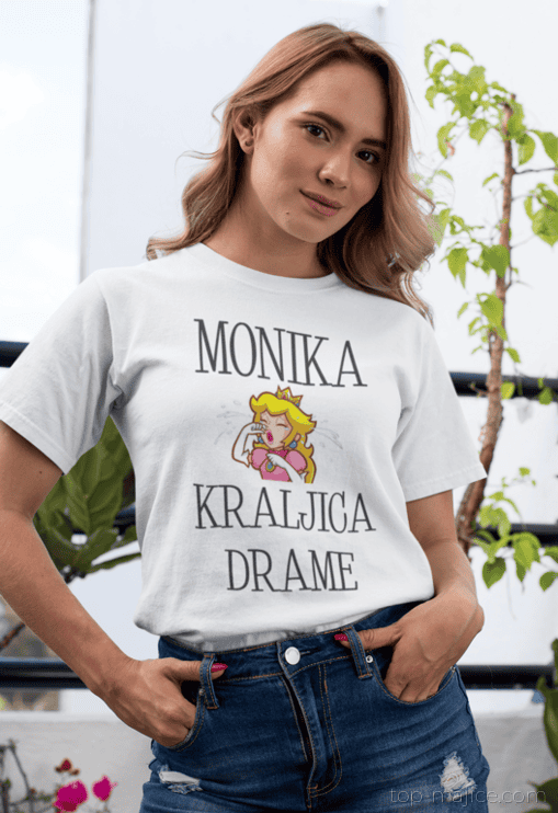 Na beli majici s kratkimi rokavi se bohoti prikupna, jokajoča princeska, nad in pod njo pa ponosno piše: MONIKA KRALJICA DRAME. Za vse Monike in “monike”, ki vedo, da je vsaka drobtinica lahko scenarij 12. sezone! Oblecite humor, objemite dramo in naj vsi vedo, kdo vodi sceno.