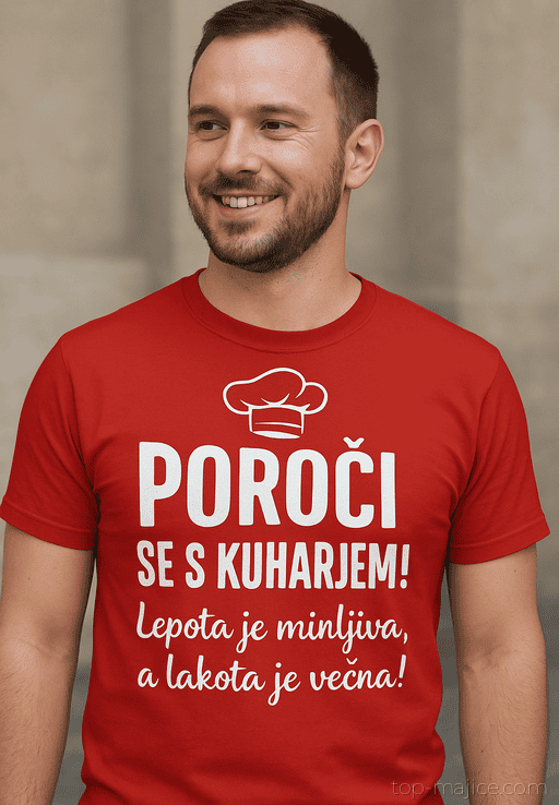 👨🍳❤️ Rdeča kratka majica, ki pove resnico na glas: POROČI SE S KUHARJEM! lepota je minljiva, a lakota je večna!