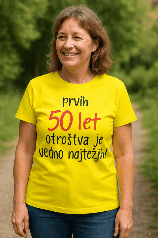 😜 Odrasel po letih, otrok po duši? Ta rumena majica s potiskom ‘prvih 50 let otroštva je vedno najtežjih!’ je tvoja nova uniforma.